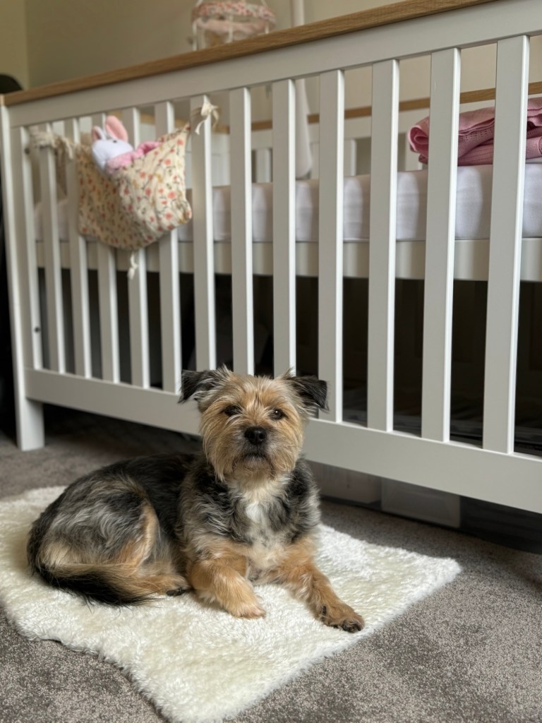 We played recordings of baby crying to help desensitise him to the unfamiliar sounds- he wasn’t fussed! When we started setting up the nursery, we also let him explore the space under supervision and get used to the new room and things in it.